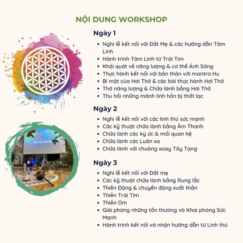 Trong 3 ngày của workshop, chúng mình mang đến những trải nghiệm để giúp bạn tự chữa lành, nâng cao rung động và kết nối lại với bản thể Thiêng Liêng của mình.